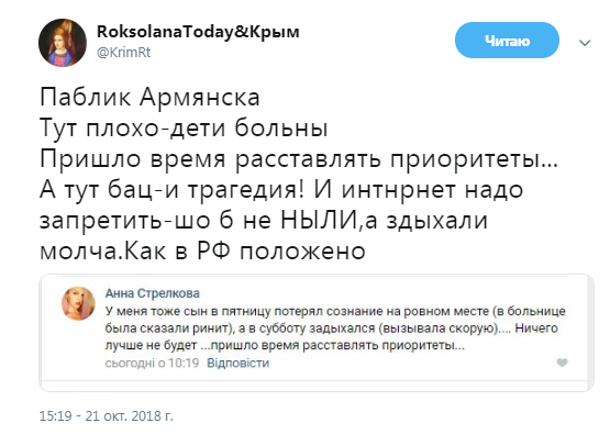 "Паблик Армянска. Тут плохо-дети больны. Пришло время расставлять приоритеты... А тут бац-и трагедия! И интернет надо запретить-шо б не НЫЛИ, а здыхали молча.Как в РФ положено", - пишет блогер.