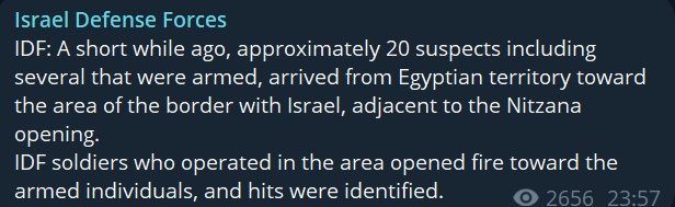 Также сообщается, что на границе между Израилем и Египтом произошла стрельба. По данным ЦАХАЛ, 20 вооруженных человек подошли с египетской стороны к границе в районе города Ницан.