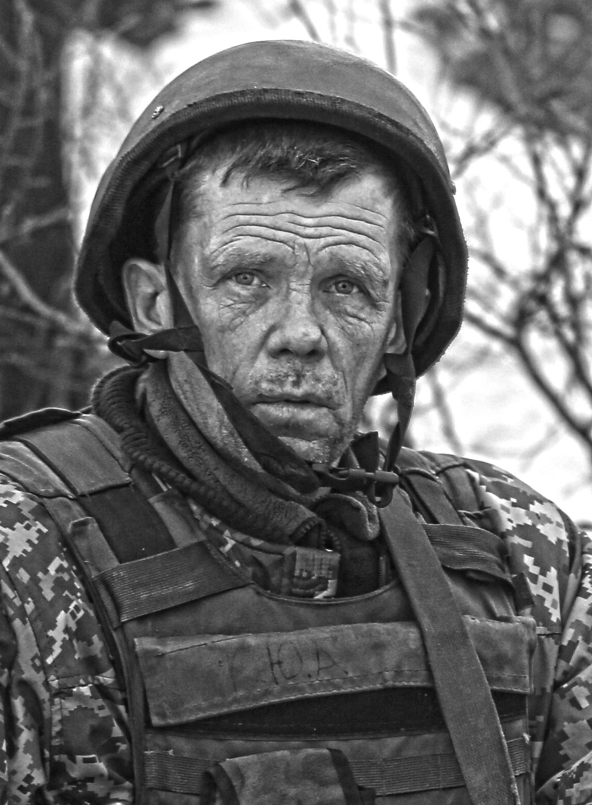 На очень символичном фото изображен солдат в каске с "почерневшим" от усталости и тревоги морщинистым лицом. На нем также бронежилет с инициалами.
