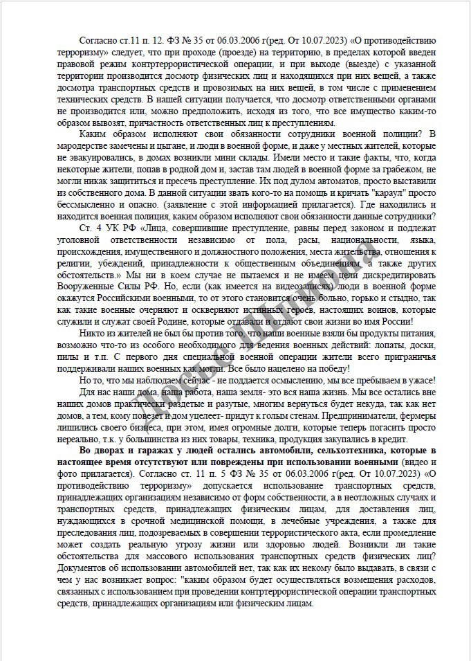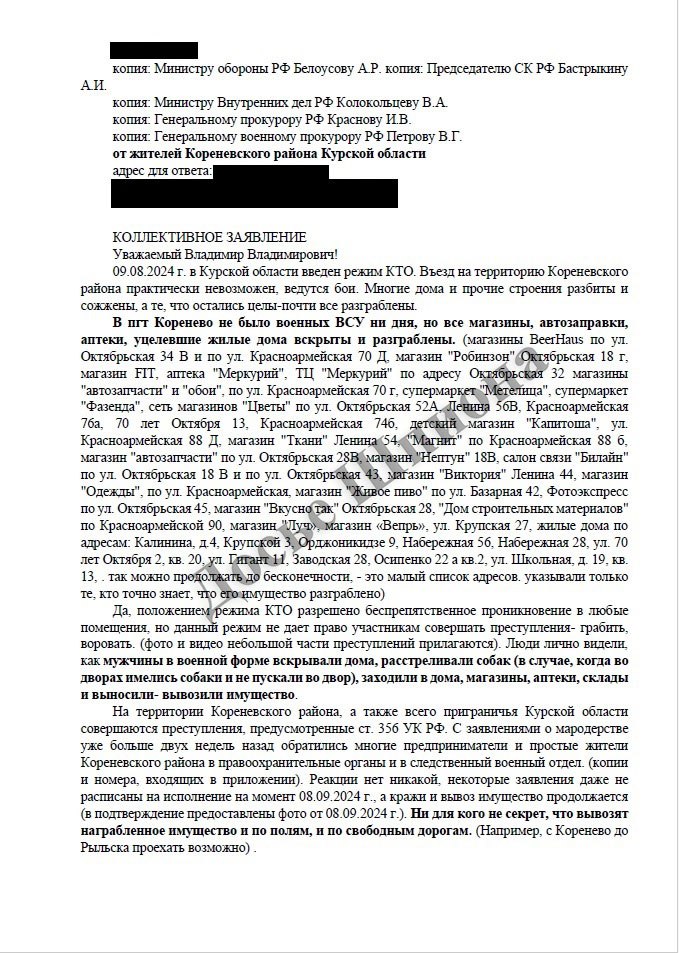 Жители пгт Коренево Курской области РФ написали коллективное обращение к Путину, в котором приводят факты мародерства и насилия, совершенного российскими военными.