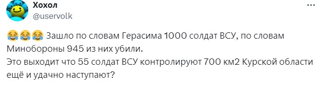 При этом 7 августа глава Генштаба Валерий Герасимов докладывал Владимиру Путину, что на территорию Курской области зашли до тысячи украинских военных. При этом Минобороны не сообщало о прибытии в Курскую область резервов ВСУ. Таким образом из заявления российских военных получается, что потери украинской группировки войск составили почти 100%.
