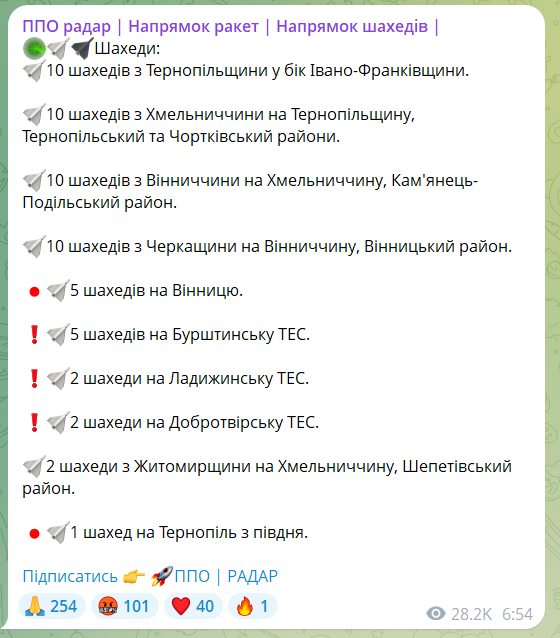 Некоторые мониторинговые каналы предполагали, что враг мог целиться по таким крупным объектам генерации, как Винницкая, Львовская и Бурштынская ТЭС, а также по другим тепловым электростанциям в западных регионах страны. В настоящее время точная информация о повреждениях и других последствиях ночного обстрела уточняется.