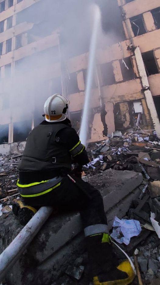 В результате попадания в цехах зафиксированы значительные повреждения и уничтожено оборудование. Сразу загорелись несколько зданий, в одном из которых спасатели до сих пор борются с огнем. Также в результате вражеской атаки пожар возник в четырехэтажном админздании, но его уже успешно потушили.