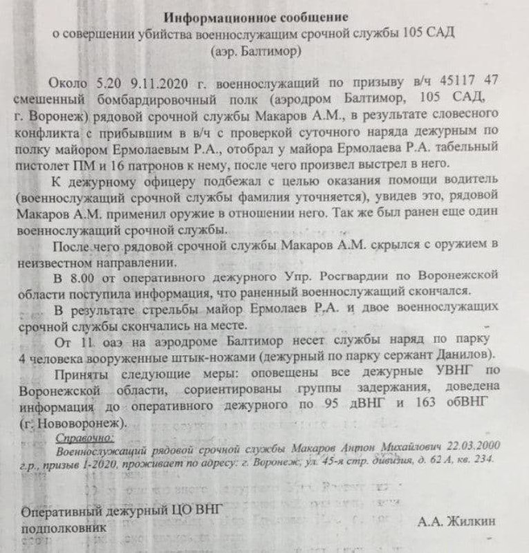 Началось все с того, что к Макарому подошел дежурный по полку с проверкой. Он отвернулся, а парень в это время взял с пожарного щита топор и ударил его в спину. Потом злоумышленник вытащил пистолет и застрелил мужчину.