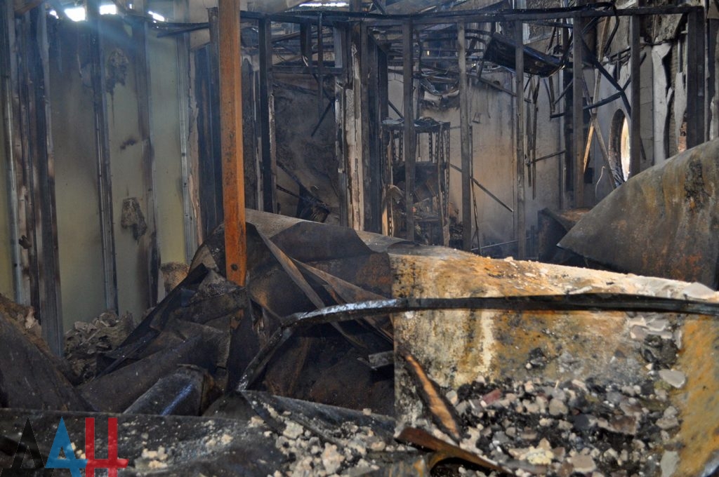 На фотографиях видно, что огонь уничтожил практически все здание донецкого дельфинария. Особенно пострадала кровля. Отмечается, что уцелели при пожаре только несущие конструкции здания.