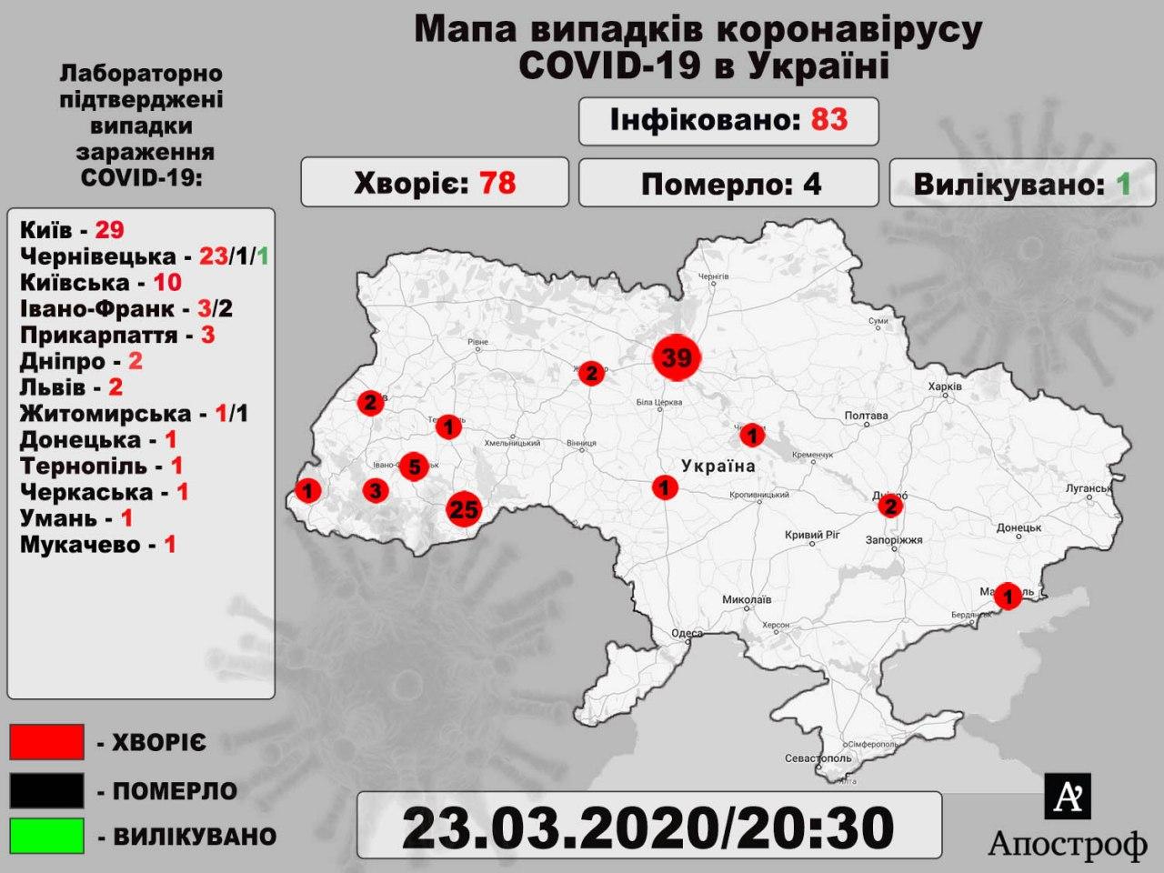 23 марта в Украине зафиксировали 11 новых случаев заражения смертельным коронавирусом. Общее число зараженных в стране составляет 84 человека.