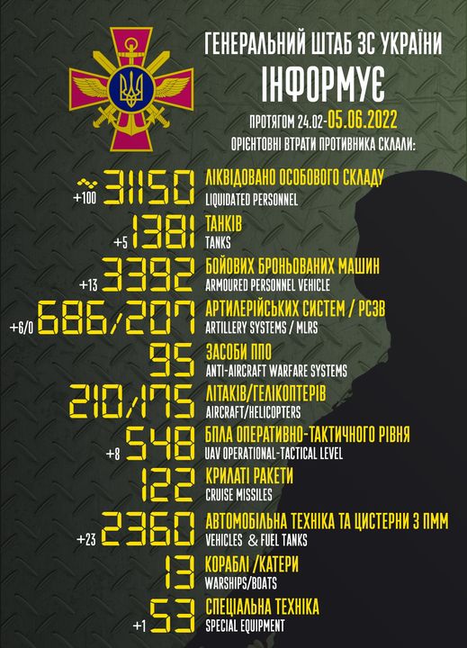 Продолжается 102 сутки полномасштабной российско-украинской войны, в которой страна-агрессор РФ продолжает нести рекордные для себя потери в живой силе и военной технике. Российское оккупационное войско потеряло более 31 тысячи личного состава и тысячи танков, ББМ и другой техники.