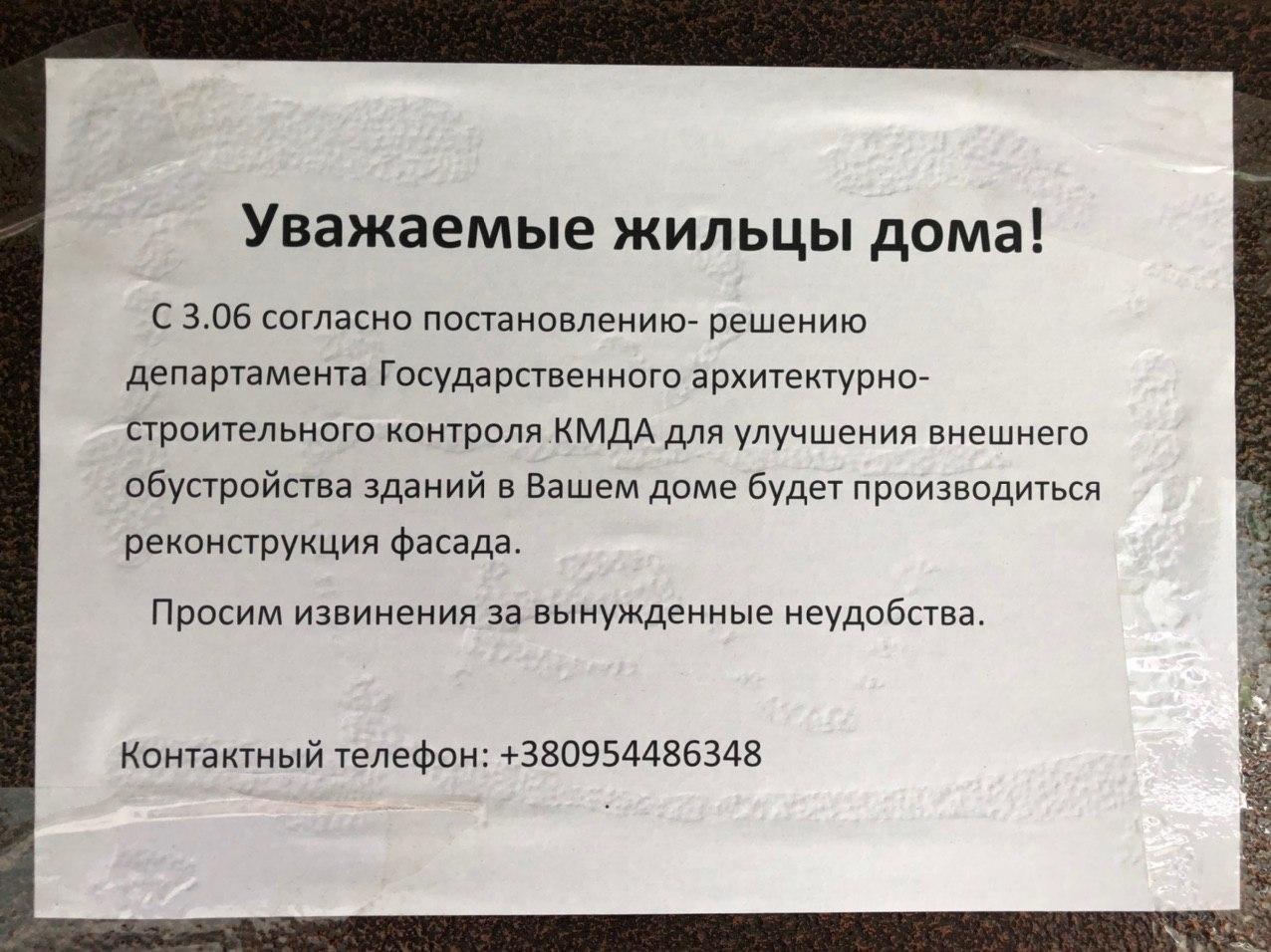 В объявлении, размещенном в подъездах дома, сказано, что "для улучшения внешнего обустройства здания проводится реконструкция фасада".