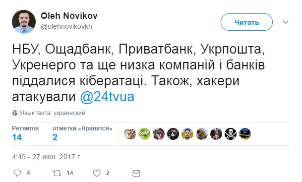 В результате сегодняшней масштабной кибератаки пострадали Национальный банк Украины, "ПриватБанк", "Укрпошта", "Укрэнерго" и "24 канал".