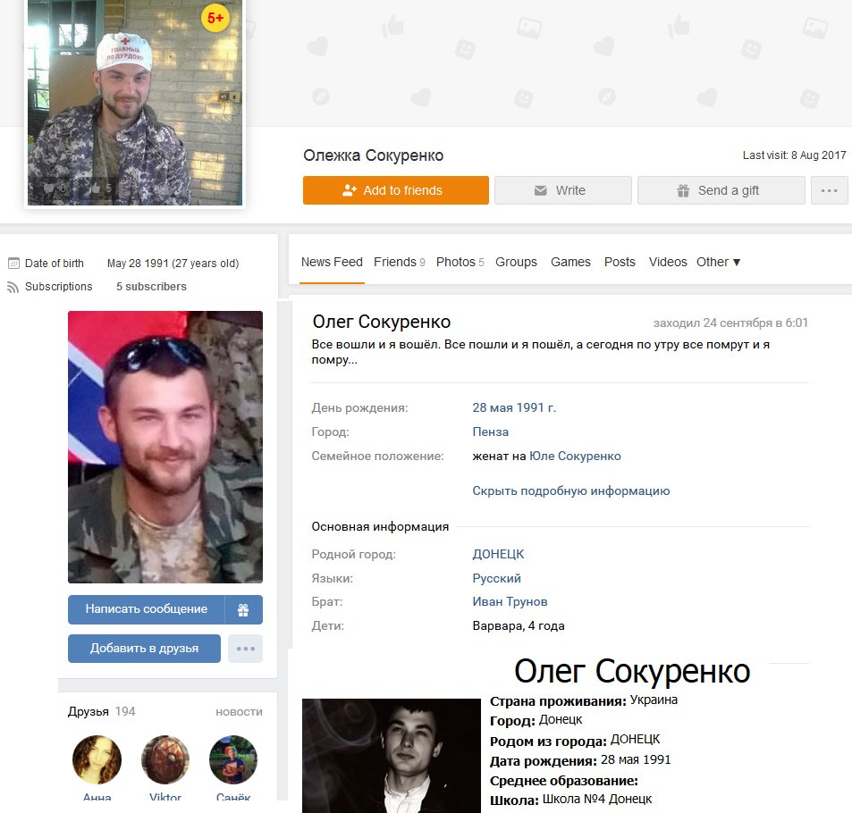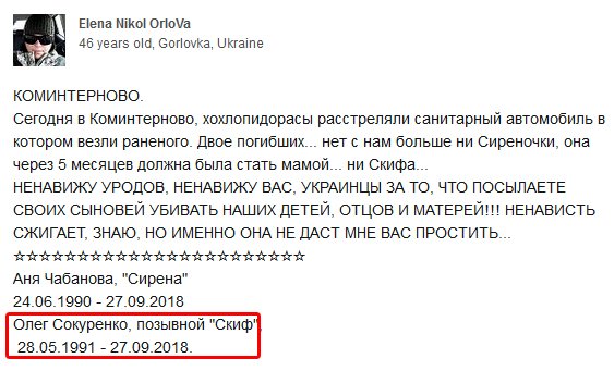 "Сокуренко Олег "Скиф" (Донецк, 28/05/91) погиб 27/09/18 в р-не Коминтерново (то ли подрыв на мине, то ли обстрел санитарного автомобиля) #9ошпмп #1ак #роа #груз200", - говорится в сообщении.