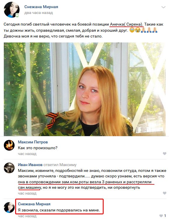 "Чабанова Анна Александровна "Сирена" (Донецк, 24/06/90) погибла 27/09/18 в р-не Коминтерново (то ли подрыв на мине, то ли обстрел санитарного автомобиля) https://psb4ukr.org/criminal/chabanova-anna-aleksandrovna/ … #9ошпмп #1ак #роа #груз200", - подписал первое фото блогер.