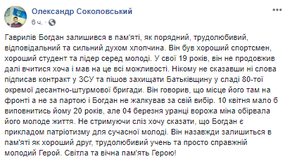 "10 апреля исполнилось ему 20 лет, но 4 марта утром вражеская мина оборвала его молодую жизнь. Не сдерживая слез хочу сказать, что Богдан является примером патриотизма для современной молодежи. Он навсегда останется в памяти как хороший друг, трудолюбивый ученик и просто настоящий молодой Герой", - подытожил Соколовский.