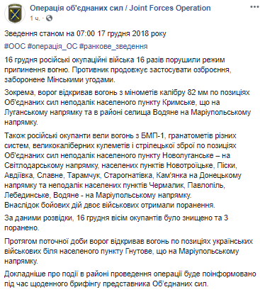 16 декабря российский оккупационные войска 16 раз нарушили режим прекращения огня по получили достойный ответ от бойцов ВСУ - 8 оккупантов ликвидировано и три получили ранения.