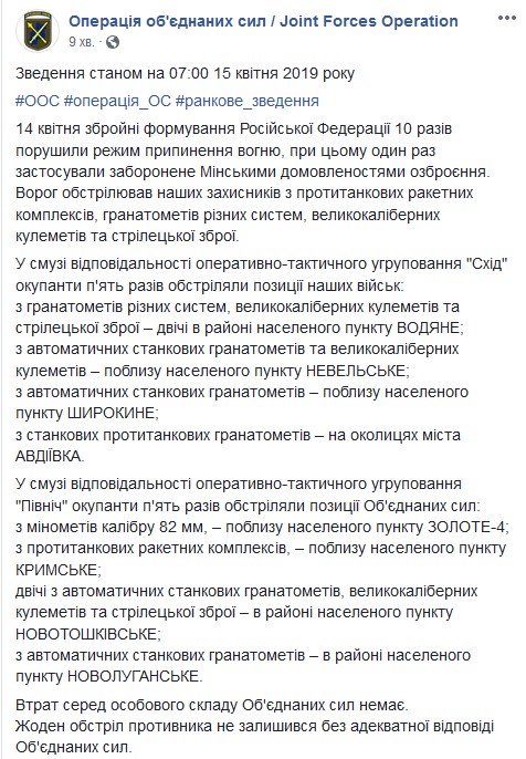 За сутки воскресенья, 14 апреля, подконтрольные Российской Федерации боевики на Донбассе 10 раз атаковали позиции украинских защитников.