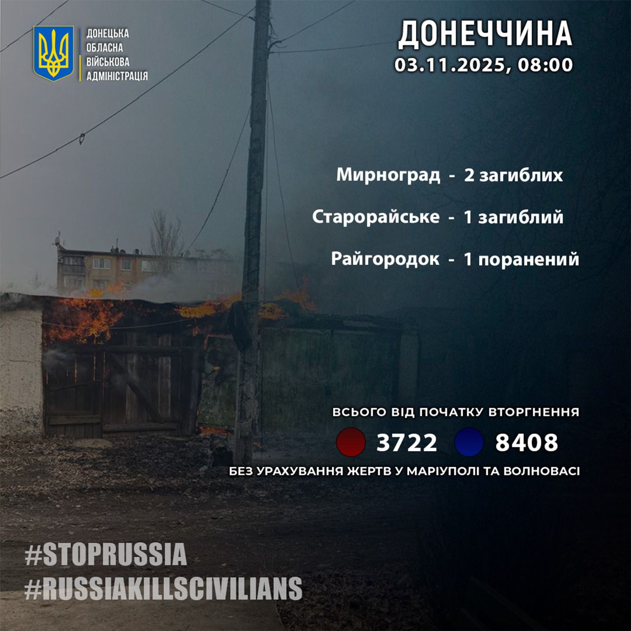 По его словам, два человека погибли из-за атаки на Мирноград и еще один – в результате атаки на Старорайское. Еще один человек получил ранения.