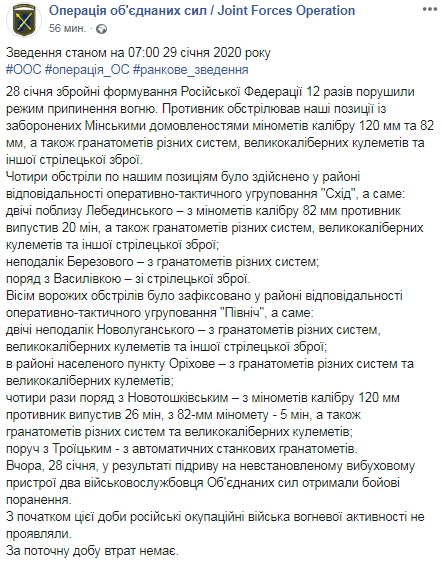 За вторник, 28 января, вооруженные формирования боевиков на Донбассе, подконтрольные Российской Федерации, нарушили режим прекращения огня более 12 раз.