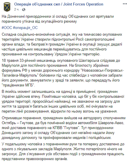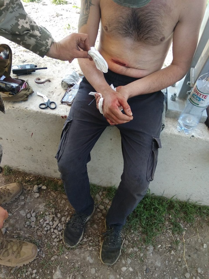 Получив ранение, гражданин вышел на автодорогу сообщением Октябрь - Гнутово, где был замечен водителем автомобиля Шавроле Авео, который доставил раненого на КПВВ "Гнутово". Здесь пограничники Донецкого отряда из состава Объединенных сил немедленно оказали ему домедицинскую помощь и проинформовалы медиков и полицейских.