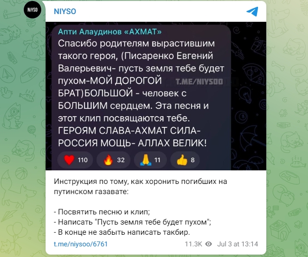 Эту новость подтвердил и командир "Ахмата", военный преступник Апти Алаудинов. Он отметил, что, в честь Писаренко кадыровцы сняли клип и написали песню.