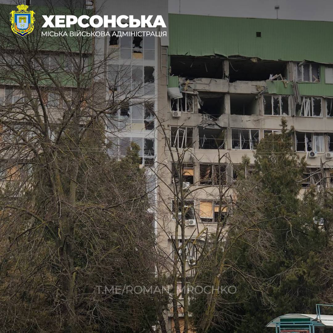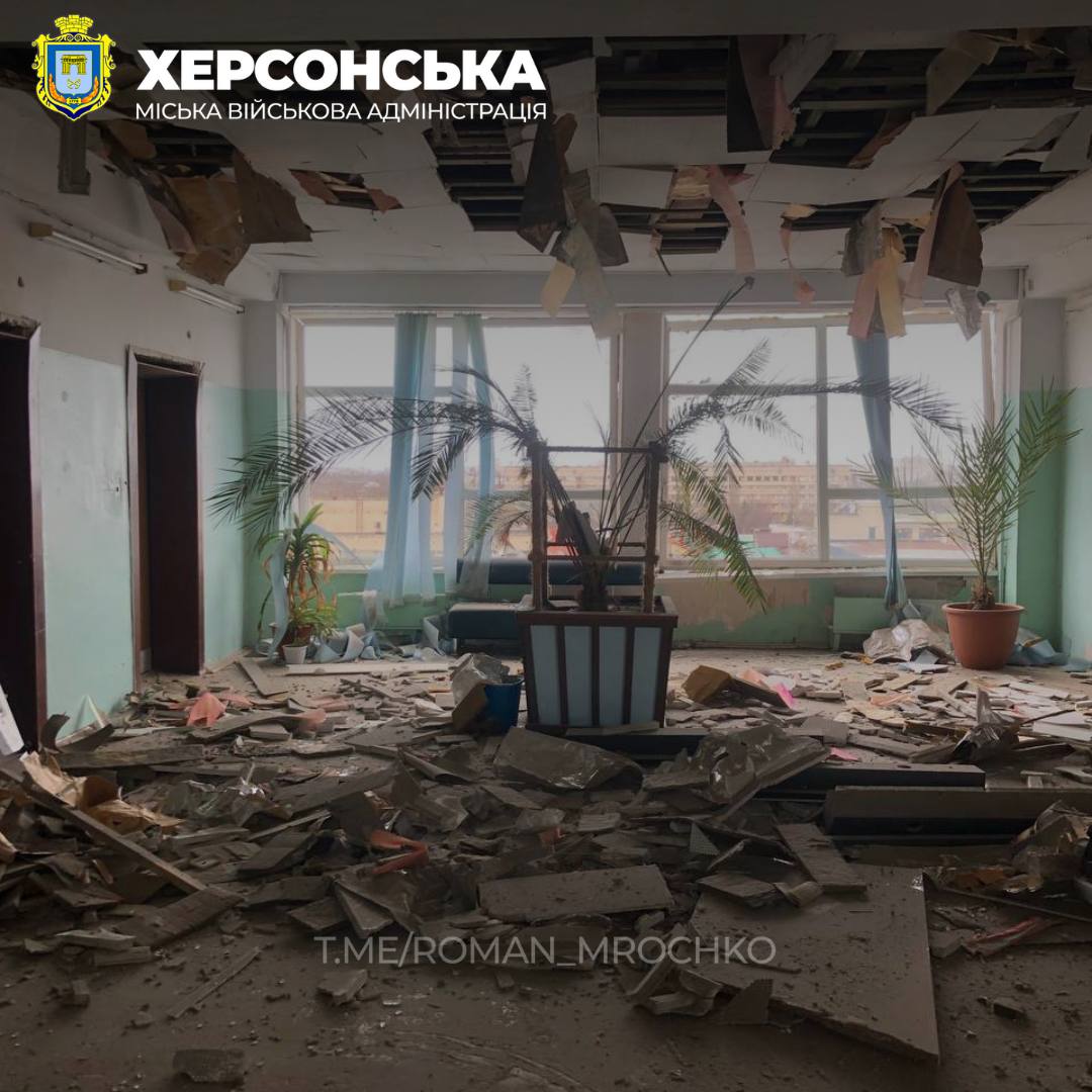 В 09:13 начальник Херсонской городской военной администрации Роман Мрочко опубликовал несколько кадров с последствиями российских ударов, указав, что враг бил с временно оккупированного левого берега: