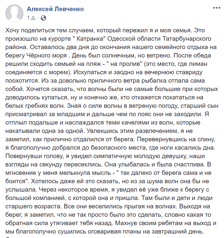 "Я отплыл подальше и наслаждался тем качелями из волн, которые накатывали одна за другой. Увлекшись этим, я не заметил, как прилично удалился от берега. Перевернувшись на спину, благополучно добрался до безопасного места. Повернув голову, я увидел симпатичную молодую девушку, наши взгляды на секунду пересеклись. Она улыбалась и была счастлива ", - отметил он.