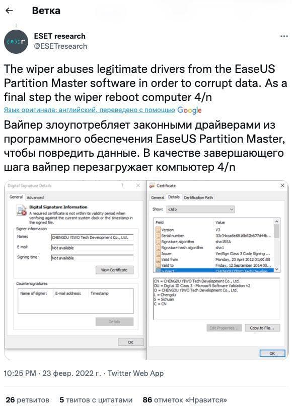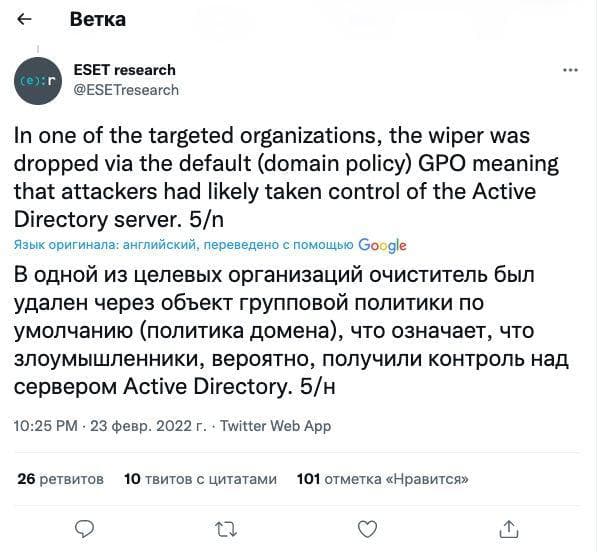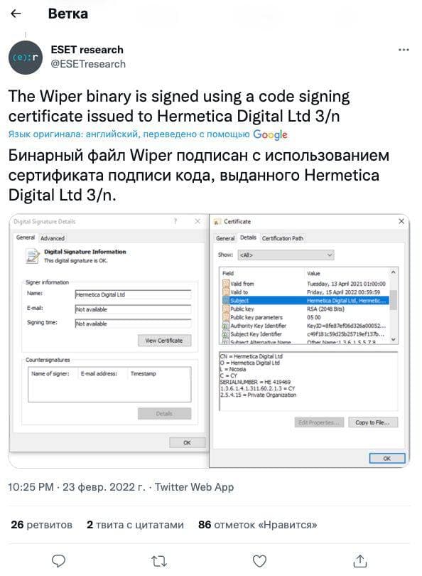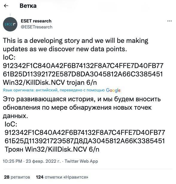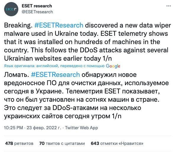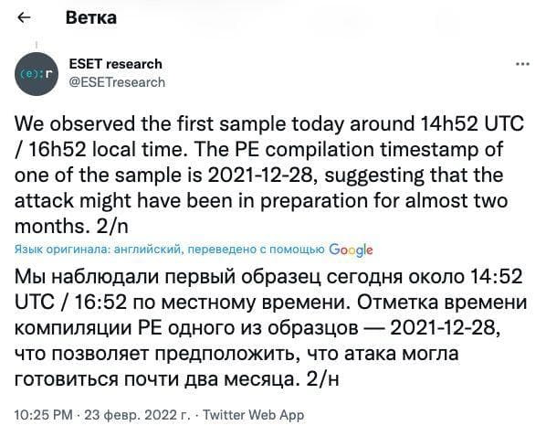 Об этом сообщил программиста ESET на своей странице в той же соцсети.