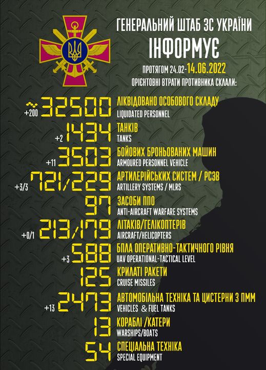 Общие боевые потери противника с 24.02 по 14.06 ориентировочно составили: