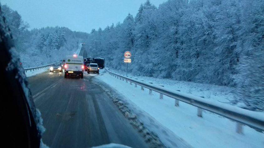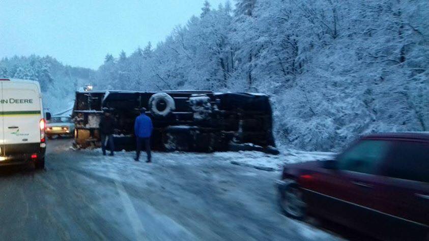 На заснеженной трассе Львов – Ивано-Франковск возле села Залесье перевернулся грузовик, частично перекрыв движение автомобилей.