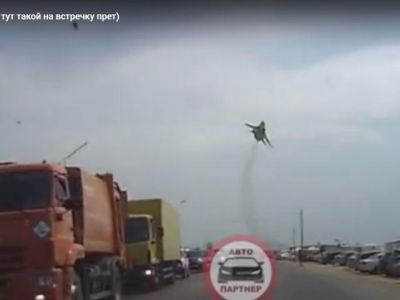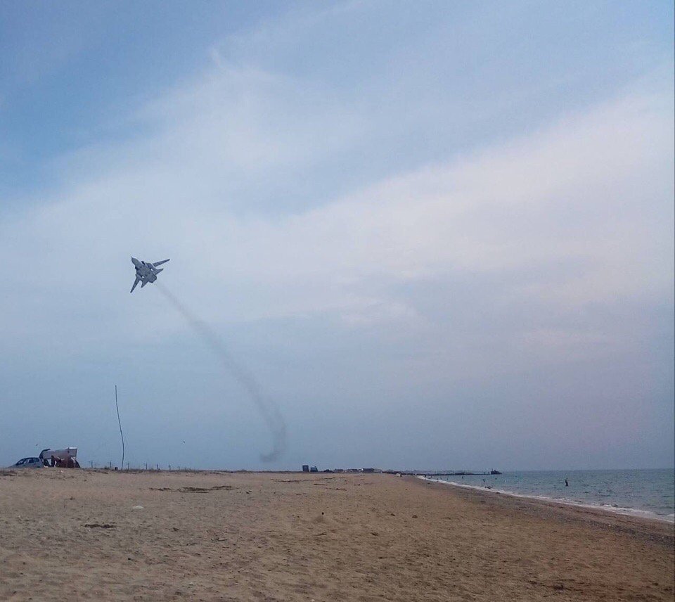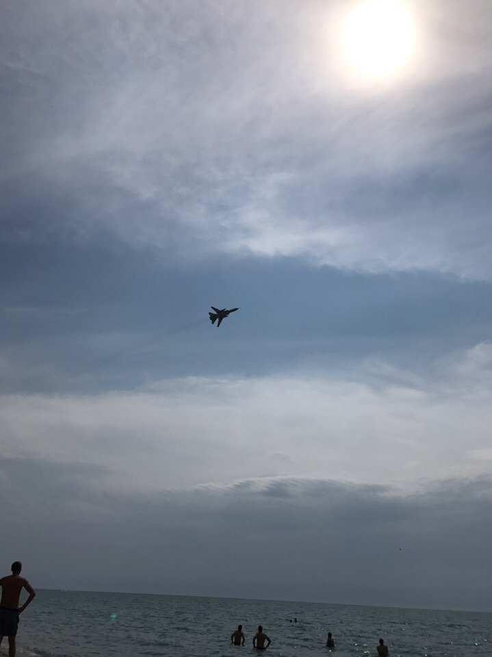 В сети появились фото, как в Евпатории над пляжем по ул. Симферопольской летают военные истребители.