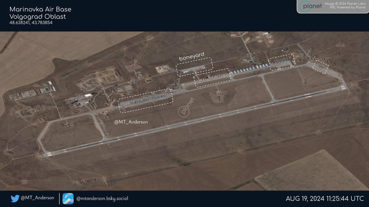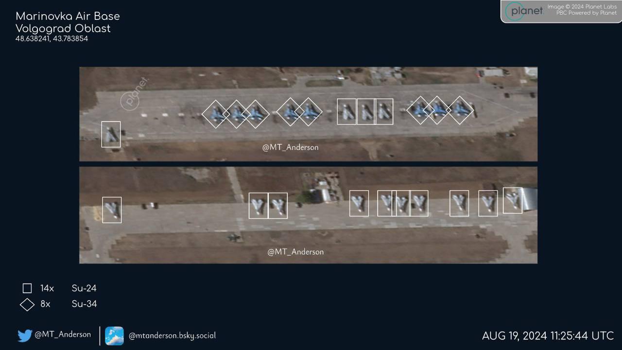 На военном аэродроме "Мариновка" в Волгоградской области, который в ночь на 22 августа посетили украинские беспилотники, стояли не только истребители Су-34, но и Су-35.