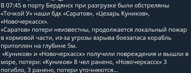 Речь идет о кораблях "Саратов", "Куников" и "Новочеркасск". Так, большой десантный корабль "Саратов" охватил пожар, а БДК "Куников" и "Новочеркасск" получили повреждения, а также понесли потери среди экипажей (11 раненых, трое погибших).