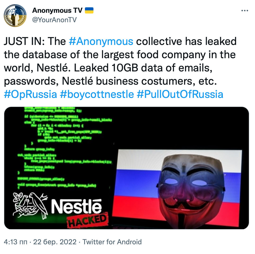 Базу данных Nestle – одной из крупнейших пищевых компаний мира – взломали хакеры Anonymous. Это произошло вследствие отказа Nestle выйти из российского рынка – компания решила продолжать поддержку экономики страны-террориста.