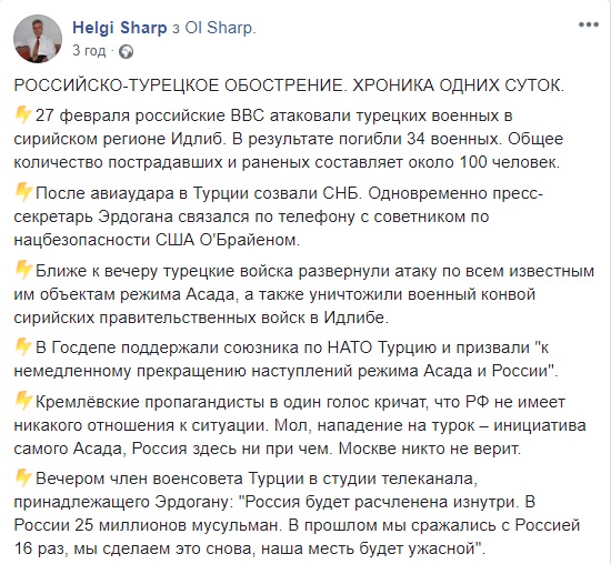 И продолжаю не верить, потому что россиянам начинать войну с турками из-за Идлиба - это все равно, что выстрелить себе в ногу. Даже не выстрелить, а заранее подставить эту ногу под циркулярную пилу. Поэтому я полагаю, что Путин предпочтет договориться, а тех летчиков, что разбомбили турецкую колонну, завтра ждет увольнение задним числом".