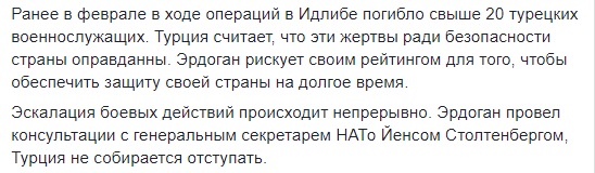 "После этой атаки все объекты режима [Асада] теперь являются вражескими для Турецкой Республики. Мы рассматриваем этот инцидент как нападение режима на международное сообщество. Завтра утром мы запустим процесс консультаций с НАТО. Атака на Турцию также является атакой на НАТО. Североатлантический альянс должен поддержать Турцию", - сказал представитель правящей партии Омер Челик.