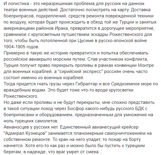 Турция не есть и никогда не будет нашим стратегическим союзником (у нее другие интересы), но в данном случае она не только вынуждает Кремль втягиваться в незапланированные военные действия, но и получает шансы в той или иной степени подключить к этим действиям Североатлантический альянс. Который может, например, закрыть небо над северной Сирией.