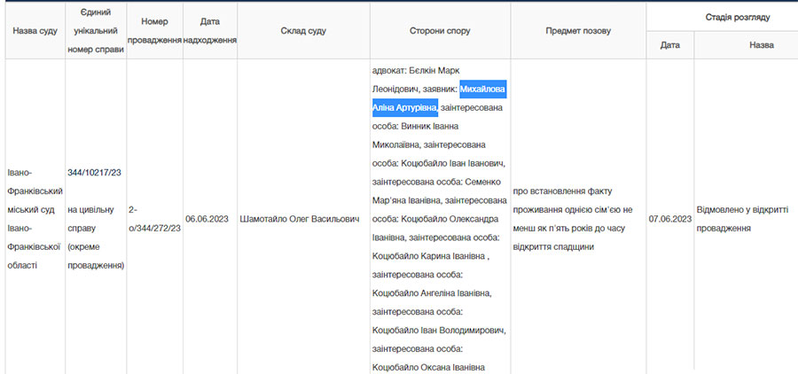По словам адвоката Михайловой Марка Белкина, женщина не относится к перечню лиц, имеющих право на назначение и получение единовременного пособия после гибели защитника. Согласно информации госпортала "Судебная власть Украины", после судебного заседания 7 июня Ивано-Франковский городской суд отказал в открытии производства по иску Михайловой.