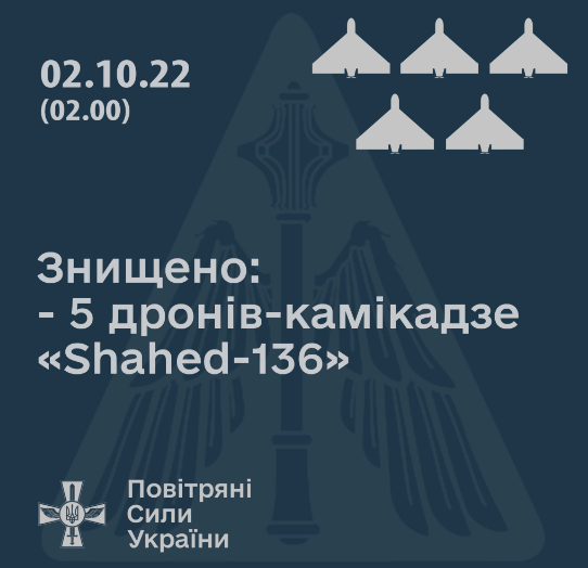 В сообщении говорится о том, что пять из семи иранских "Shahed-136" уничтожены военнослужащими зенитной ракетной Одесской бригады и Херсонской зенитной ракетной бригады Воздушное командование "Юг" Воздушных Сил Вооруженных Сил Украины.