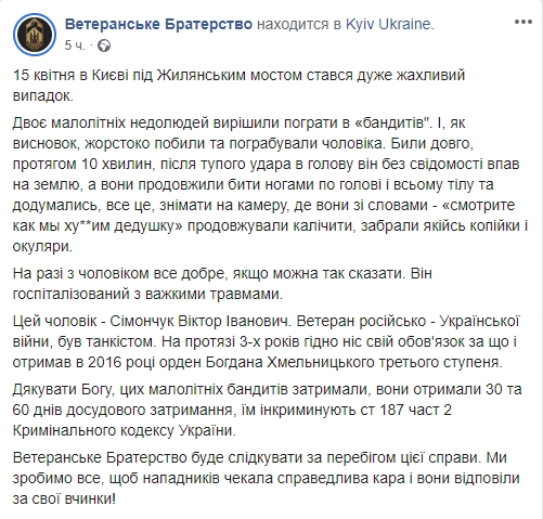 "Двое малолетних недолюдей решили поиграть в "бандитов". И, как вывод, жестоко избили и ограбили мужчину. Били долго, в течение 10 минут, после тупого удара в голову он без сознания упал на землю, а они продолжили бить ногами по голове и всему телу и додумались, все это, снимать на камеру, где они со словами - "смотрите как мы ху**им дедушку" продолжали калечить, забрали какие-то копейки и очки", - сказано в сообщении.