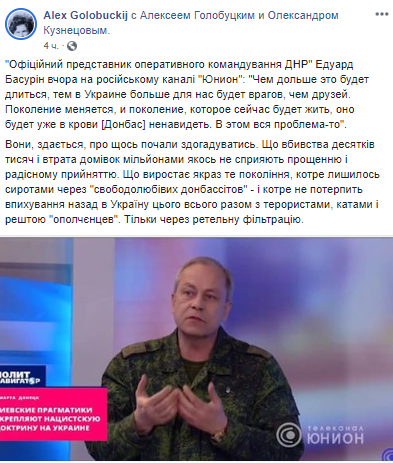 Главарь так называемой ДНР Эдуард Басурин на одном из российских телеканалов признал, что будущее поколение украинцы будет ненавидеть представителей оккупированного Донбасса и воспринимать их врагами.