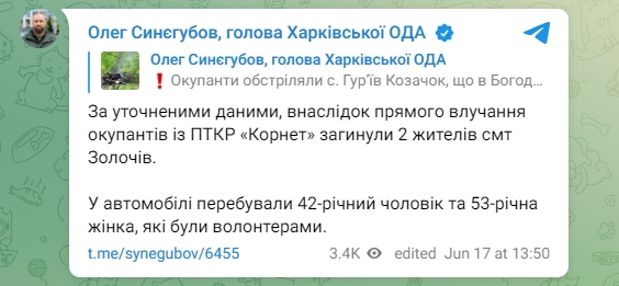 Позже он уточнил, что в результате прямого попадания оккупантов из ПТКР "Корнет" погибли 2 жителя пгт Золочев. В автомобиле находились 52-летний мужчина и 53-летняя женщина, которые были волонтерами.