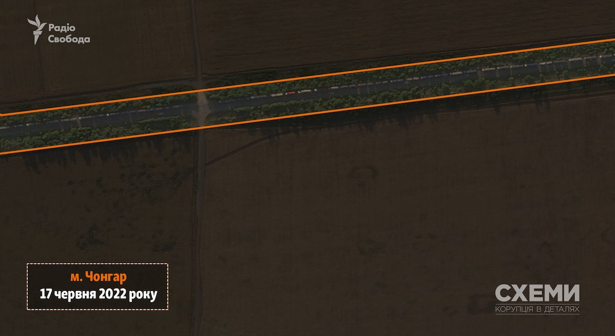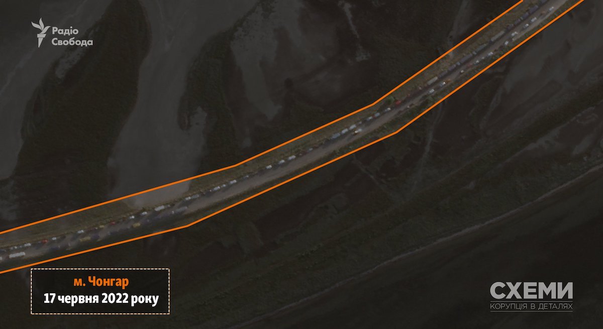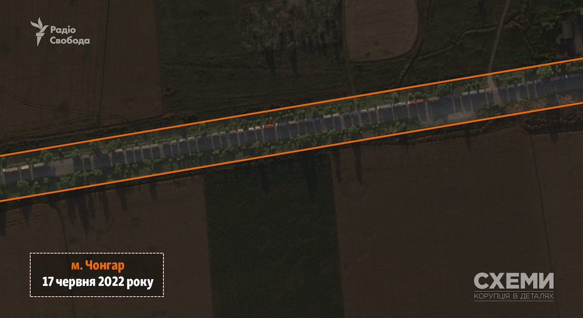 17 июня, в субботу, спутник Planet Labs зафиксировал движение колонн грузовиков, ехавших с временно оккупированных украинских территорий в аннексированный Крым. Как пишут "Схемы", по пути к пропускному пункту Чонгар насчитали около 100 грузовиков. В то же время, это не первый случай, когда спутник фиксирует, как страна-террорист Россия вывозит украинское зерно.