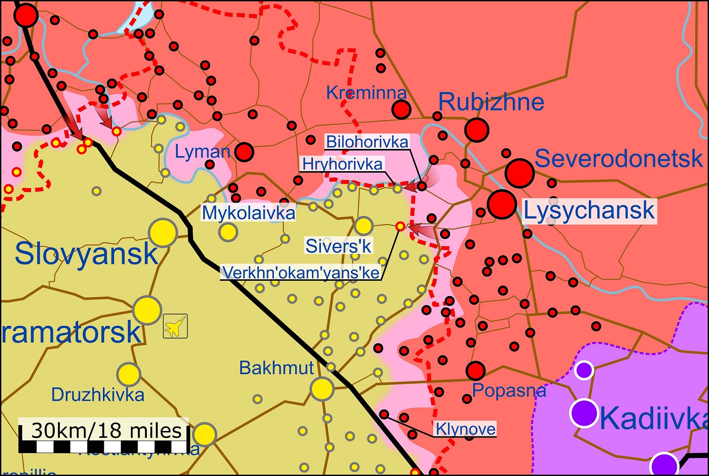 Так, на карте видно, что наиболее активные бои ведутся на востоке и юге страны.