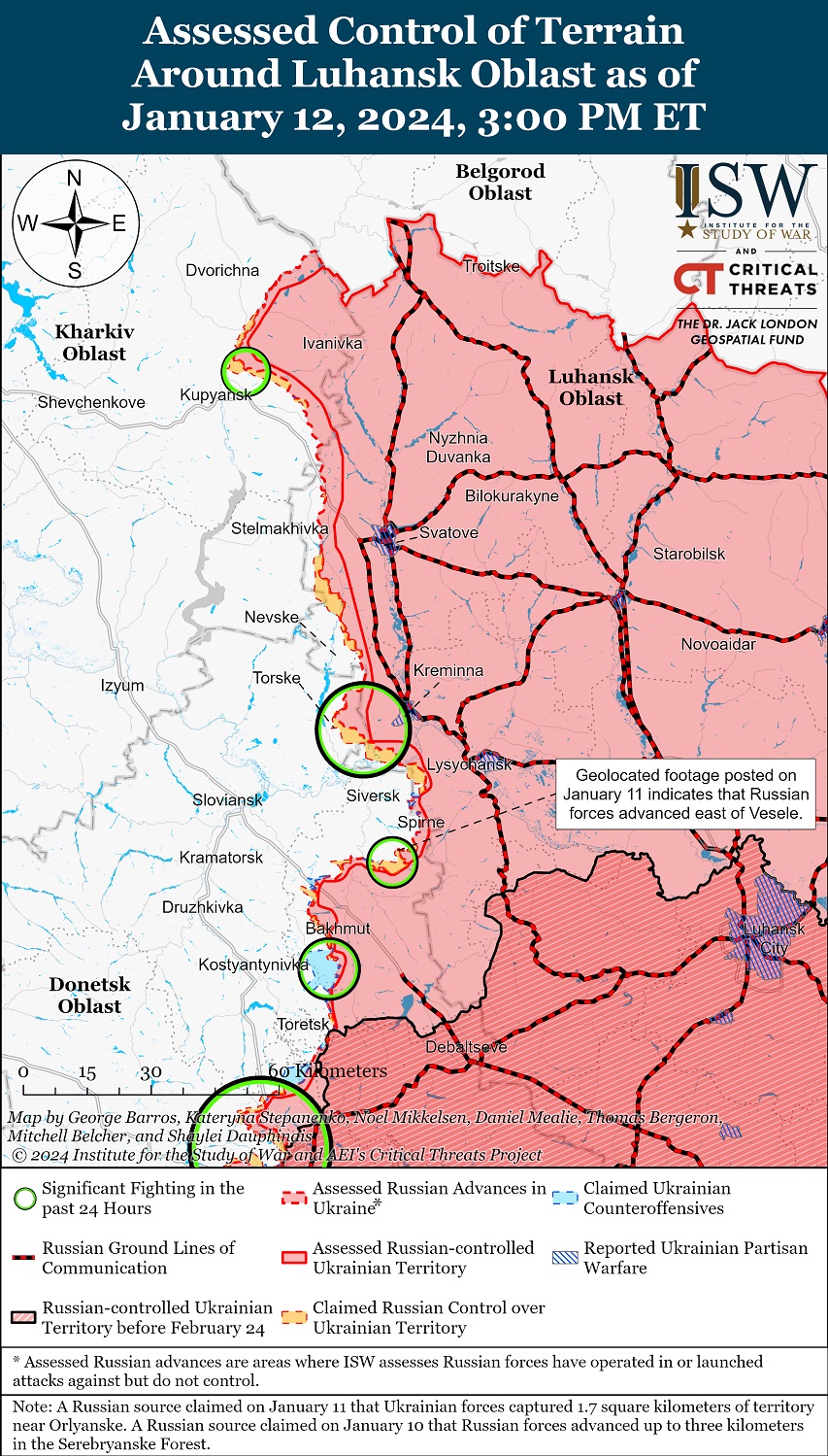 Российские войска продолжают натиск на Донбассе и незначительно продвинулись в районе Веселого (к северо-востоку от Бахмута) и к северо-западу от Авдеевки.