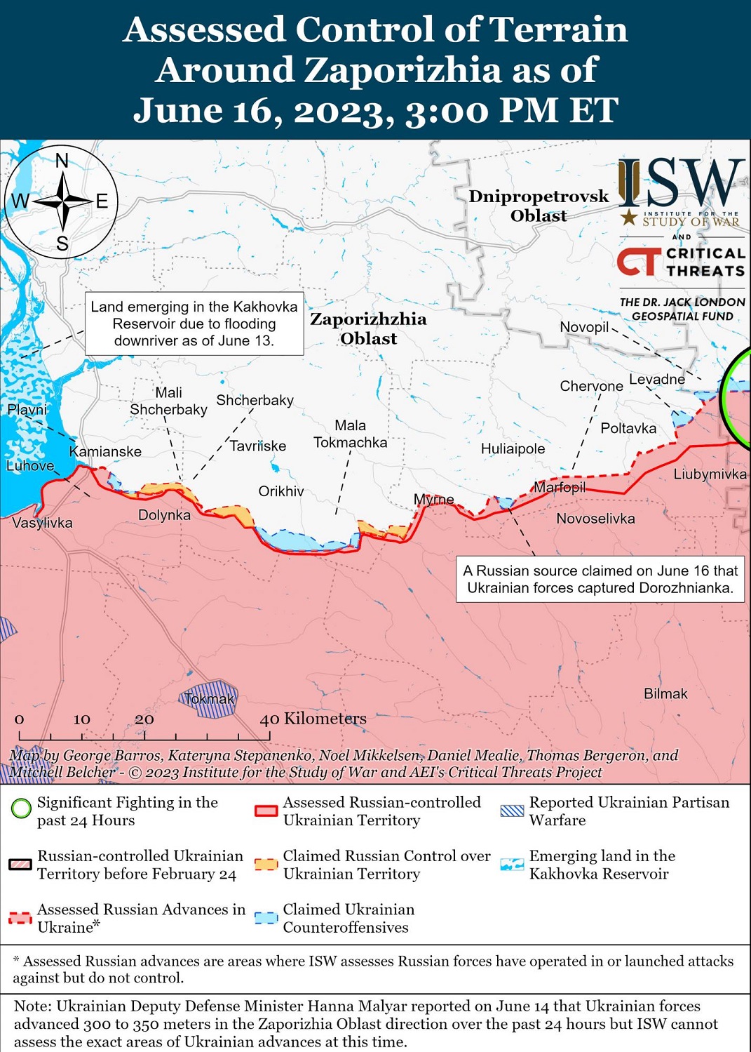 Украинские силы продолжили наземные атаки в районе Угледара 16 июня. Генштаб Украины сообщил, что украинские силы добились успеха возле Угледара (30 км к юго-западу от Донецка) и закрепились на новых позициях. Генштаб Украины сообщил, что российские войска совершили контрудар в направлении Водяного (6 км к северо-востоку от Угледара). Украинские войска продолжали контрнаступательные действия на административной границе Донецкой и Запорожской областей и добились успехов в этом районе. В Генштабе Украины сообщили, что украинские войска провели успешные наступательные действия вдоль линии Левадно-Старомейорское (20 км к юго-западу - 10 км к югу от с. Большая Новоселка). Также, украинские войска провели успешные наступательные действия в направлении Новоданиловка-Работино (6-15 км к югу от Орехова).