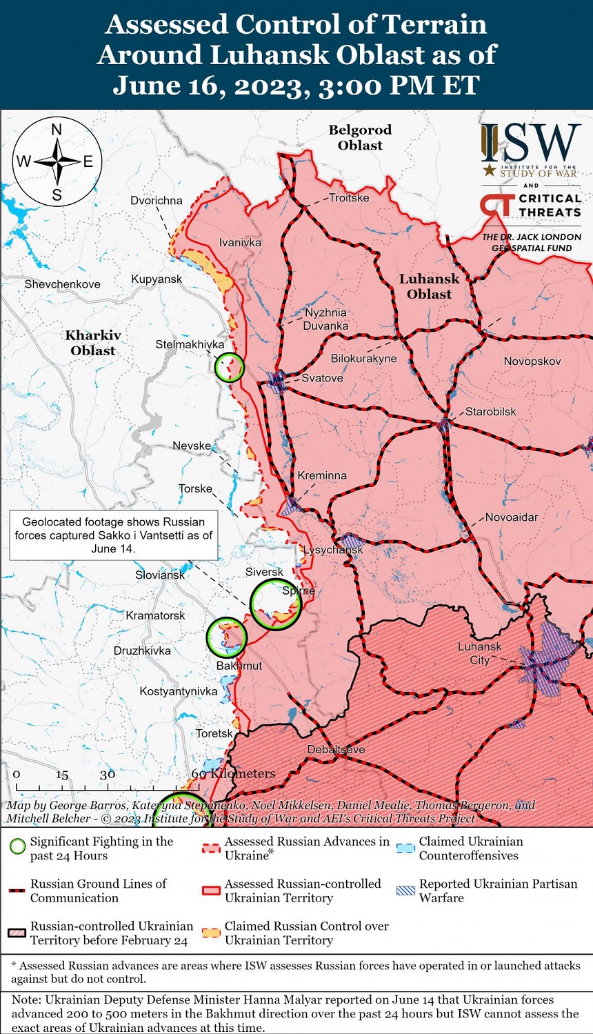 Российские и украинские силы совершили ограниченные наземные атаки вокруг Бахмута. Геолокационные кадры, опубликованные 16 июня, показывают, что оккупантам удалось продвинуться вблизи Курдюмовки (14 км юго-западнее Бахмута). В Генштабе Украины сообщали, что российские войска вели безуспешные наступательные действия вблизи Раздоловки (19 км северо-восточнее Бахмута), Орехово-Васильевки (11 км северо-западнее Бахмута) и Ступочек (13 км юго-западнее Бахмута). Командующий Сухопутными войсками ВСУ генерал-полковник Александр Сырский заявил, что российские войска перебрасывают часть своих наиболее боеспособных подразделений на Бахмутское направление. Сырский также заявил, что украинские войска занимают позиции на высотах и в лесных массивах, и вытесняют российские войска с позиций в районе Бахмута. Геолокационные кадры, опубликованные 16 июня, указывают на украинское продвижение к западу от Ягодного. Произошли боестолкновения на линии Авдеевка-Донецк. Геолокационные кадры, опубликованные 16 июня, показывают, что российские войска достигли ограниченных успехов вблизи Новоселовки (17 км северо-восточнее Авдеевки). В Генштабе Украины сообщили, что российские войска вели безуспешные наступательные действия вблизи Авдеевки, Степного (7 км северо-западнее Авдеевки), Марьинки (на юго-западной окраине Донецка), Красногоровки (5 км севернее Марьинки) и Новомихайловки (10 км к югу от Марьинки). Министерство обороны России заявило, что российские силы отразили пять украинских атак вблизи Степного, Первомайского (11 км юго-западнее Авдеевки) и Старомихайловки (19 км юго-западнее Авдеевки).