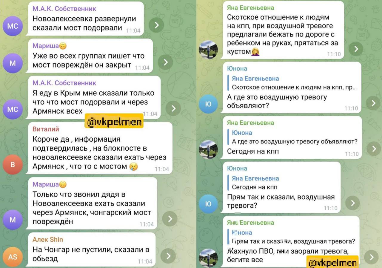 Местные жители в соцсетях сообщили, что после обстрела оккупационные власти ограничили движение транспорта по мосту. По словам гражданских, на дорогах появились мобильные блокпосты, на которых захватчики всех разворачивают и заставляют ехать в объезд. Местные жители также рассказали, что после объявления воздушной тревоги захватчики предлагали мирным "спрятаться в кустах".