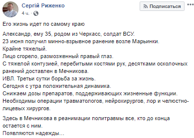 "Его жизнь идет по самому краю. Александр, ему 35, родом из Черкасс, солдат ВСУ. 23 июня получил минно-взрывное ранение возле Марьинки. Крайне тяжелый. Лицо сгорело, размозженный правый глаз. С тяжелой контузией, перебитыми костями рук, десятками осколочных ранений доставлен в Мечникова", - написал доктор.