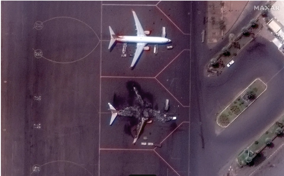 Опубликованы спутниковые снимки аэропорта Хартума в Судане, где в результате столкновений были повреждены самолеты.