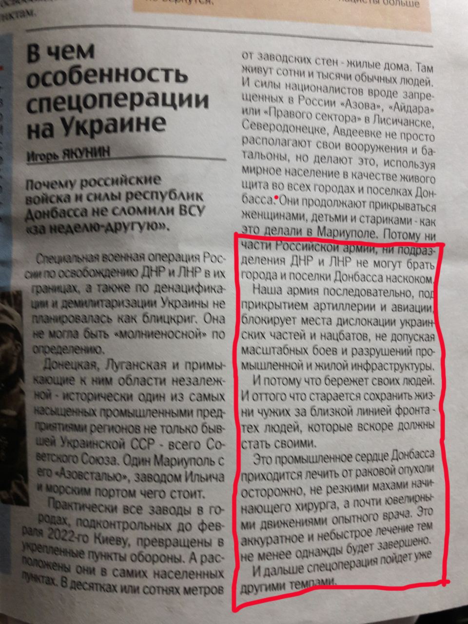 В газетах, которые распространяют в пунктах выдачи гуманитарной помощи, пропагандисты цинично заявляют, что якобы ВС РФ совместно с незаконными вооруженными формированиями самопровозглашенной "ДНР" хирургически точно и без массовых разрушений взяли город.