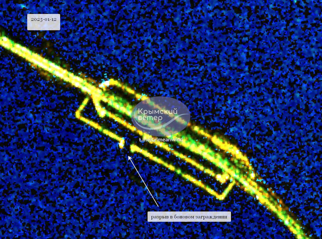 "На вчерашнем снимке в радиолокационном диапазоне видно отсутствие части боновых заграждений, тогда как позавчера их цепь была непрерывной", - напоминают в сообщении.