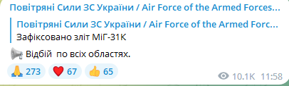 По информации Воздушных сил, сигнал тревоги связан со взлетом российского носителя ракет "Кинжал".